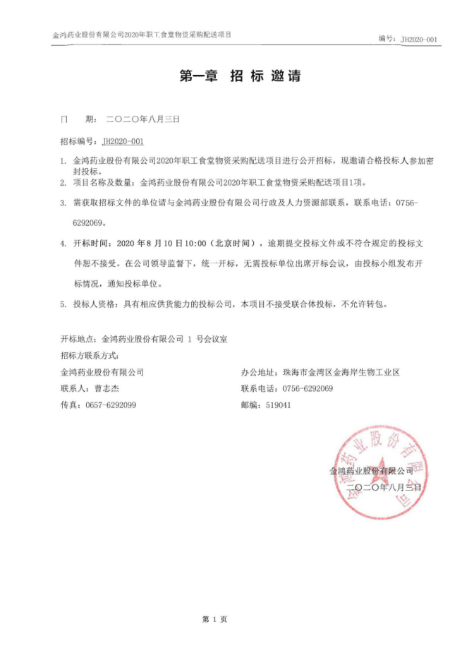 诚信为本药业股份有限公司2020年饭堂食品配送采购项目招标文件(1).zip